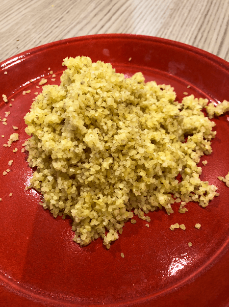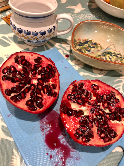 - It’s optional, but if you’ve got a pomegranate to hand, cut it in half (across, not down), hold half over a bowl and bash the skin with a heavy wooden spoon. That should loosen most of the seeds easily, but expect juice to spit! Put half the seeds and a snip of mint or parsley in your cous cous or bulgar wheat, if making.