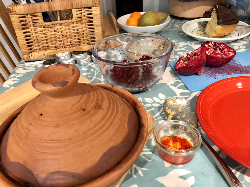- Take the tagine out of the oven, place carefully on a heat resistant surface, take the lid off and pour the saffron sugar water over. Sprinkle the remaining pomegranate seeds over the tagine, along with some snipped up parsley or mint, if you have it.